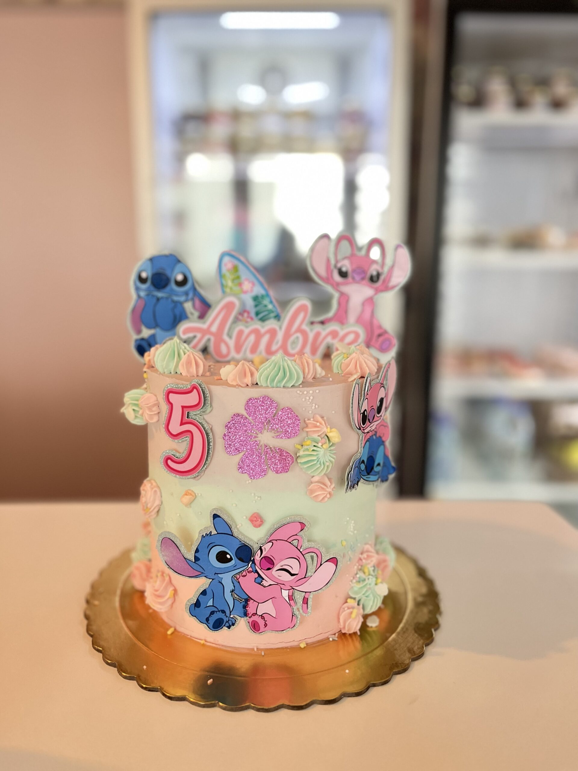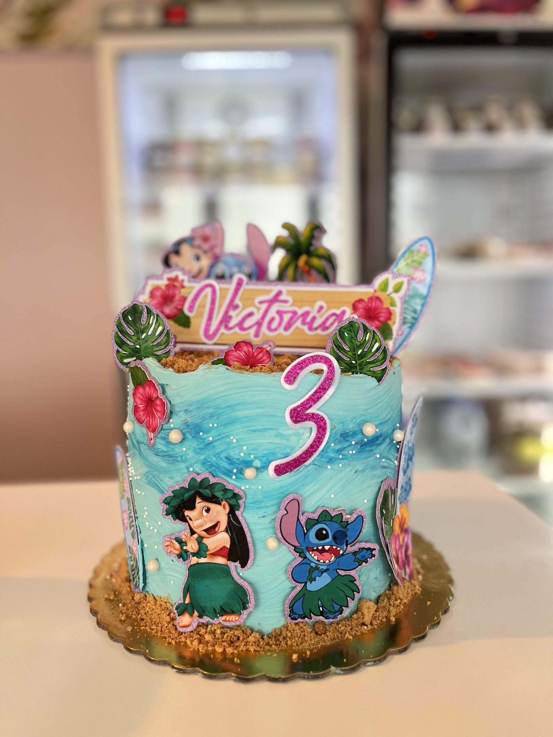 Plongez dans l’univers tropical et coloré de Lilo et Stitch avec ce magnifique gâteau, idéal pour un anniversaire plein de douceur. Recouvert d’une crème au beurre légère à la vanille, ce gâteau est décoré avec des touches pastel de bleu et rose qui rappellent l’amitié unique entre Lilo et son compagnon extraterrestre. Le prénom de l’enfant et l’âge sont personnalisés avec des lettres et chiffres scintillants, créant une ambiance festive et joyeuse. Ce gâteau savoureux, à la fois tendre et amusant, doit être conservé au réfrigérateur et sorti 30 minutes à 1 heure avant la dégustation pour profiter pleinement de sa texture onctueuse et de ses saveurs gourmandes.